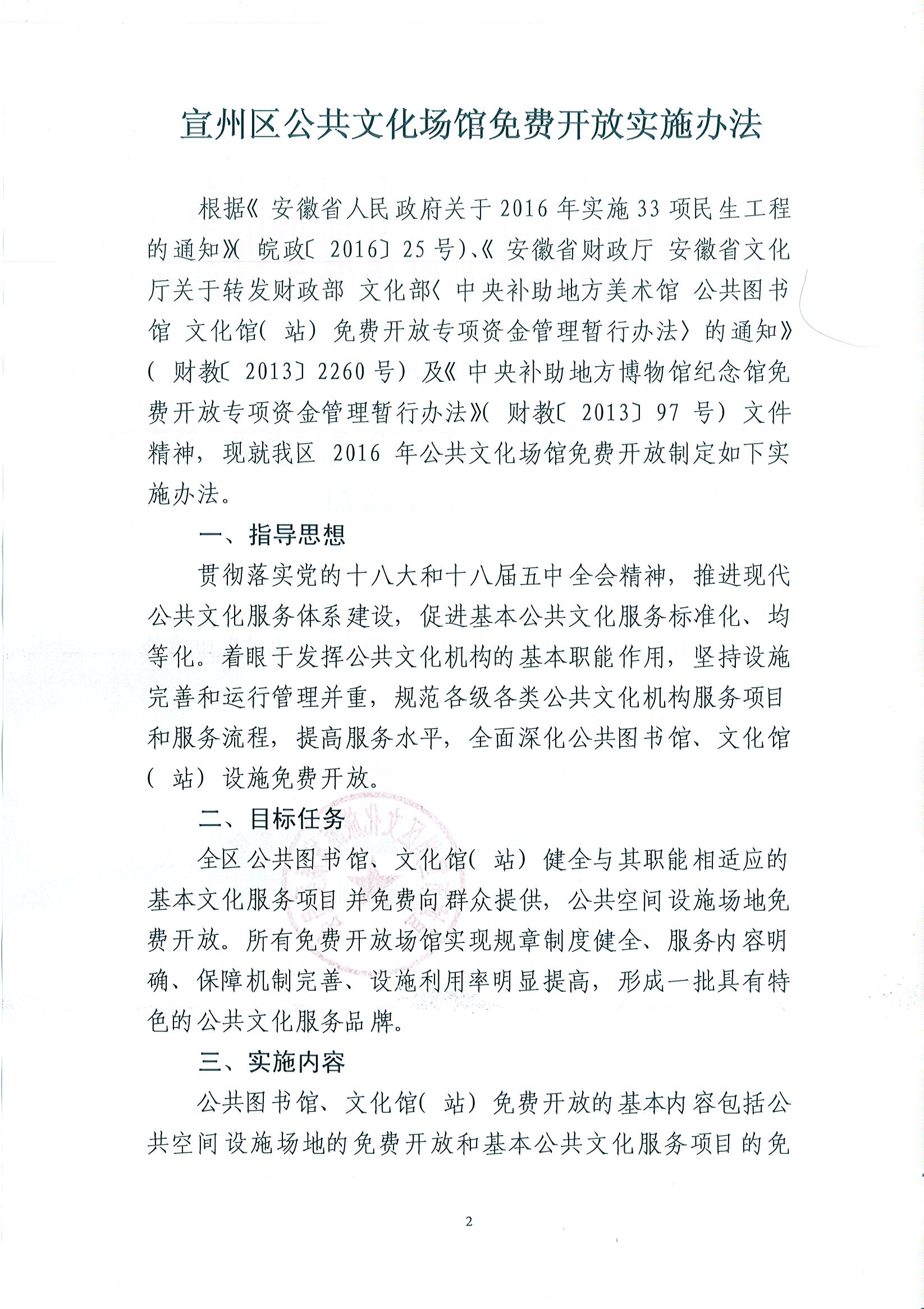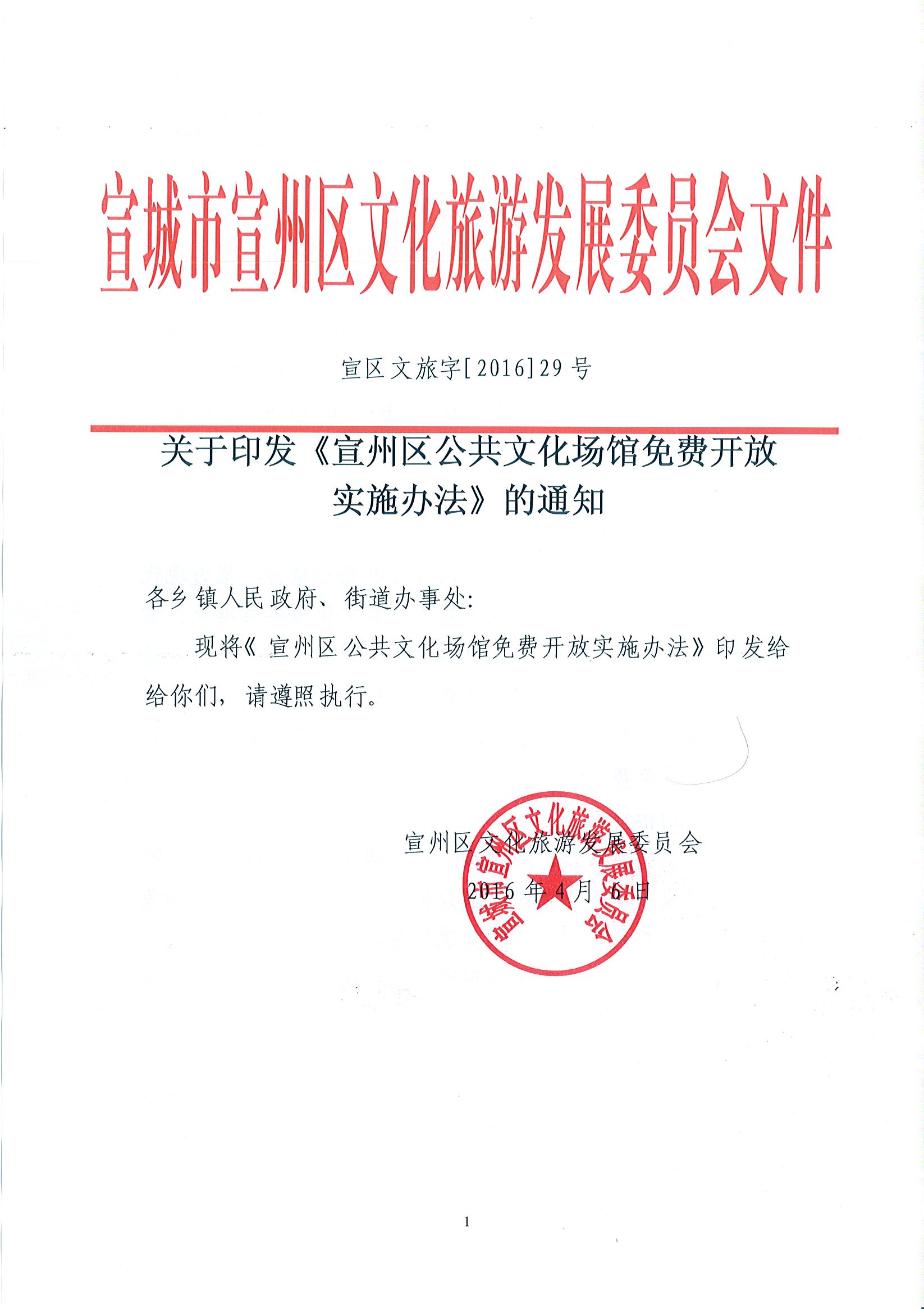 | 名稱: | 關于印發(fā)《宣州區(qū)公共文化場館免費開放實施辦法》的通知 | 文號: | |